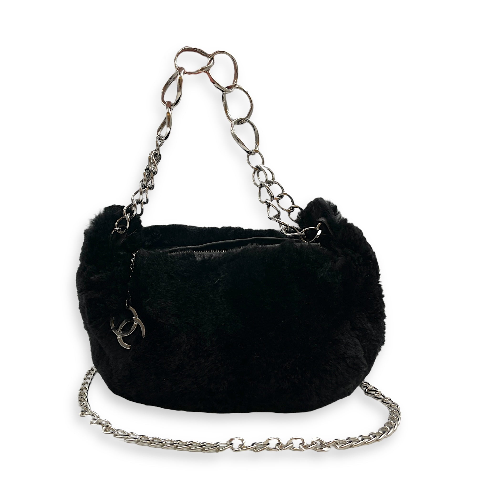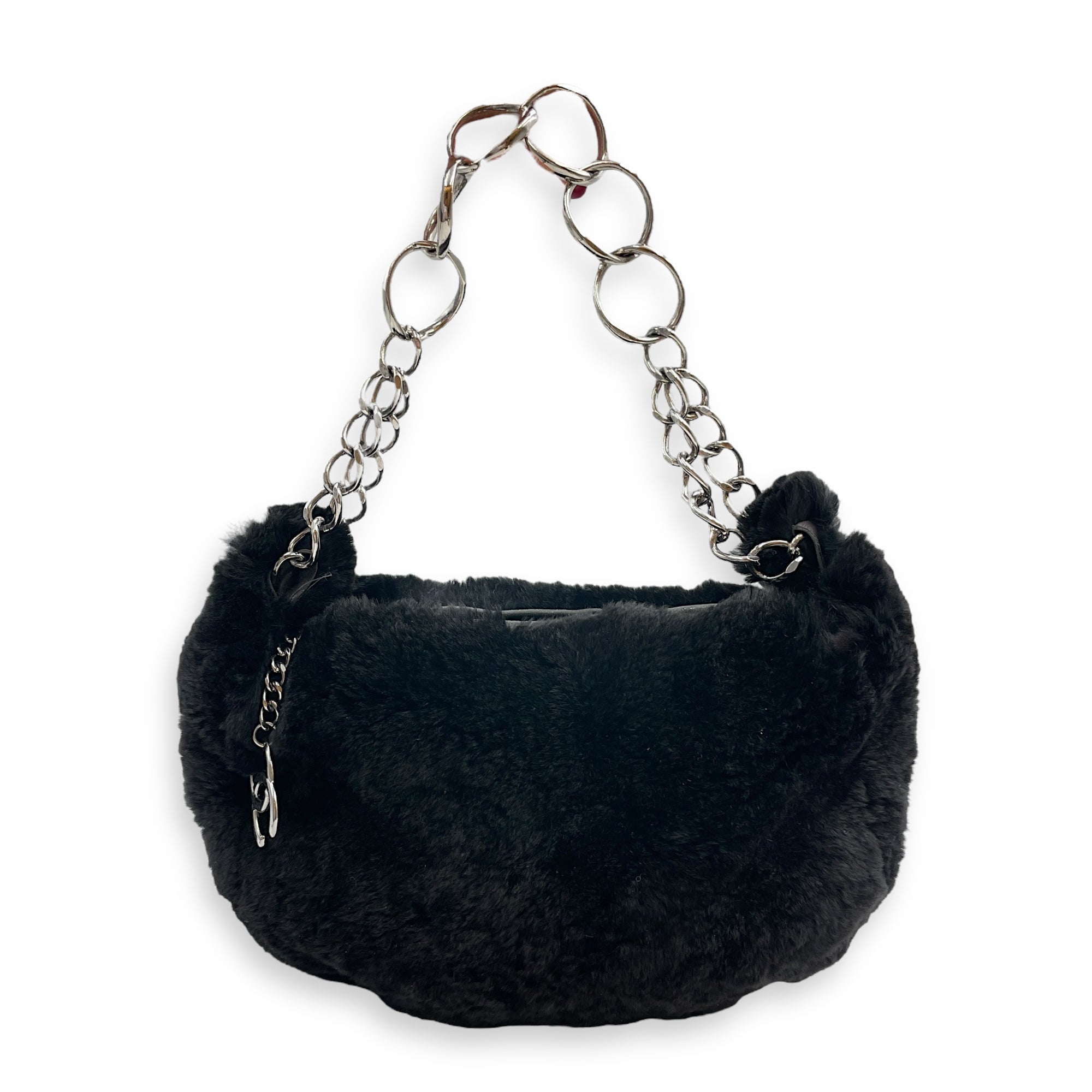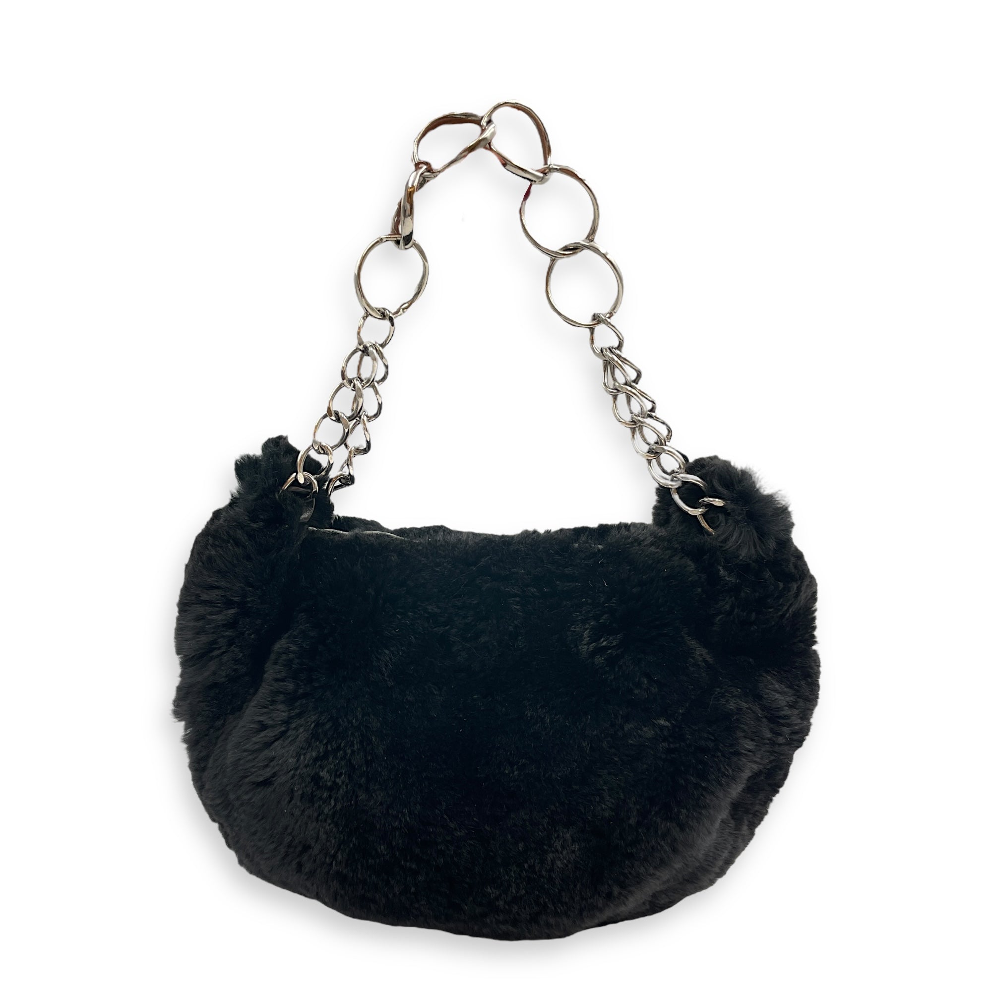 Vintage Black Shoulder Bag in Faux Fur, Silver hardware
